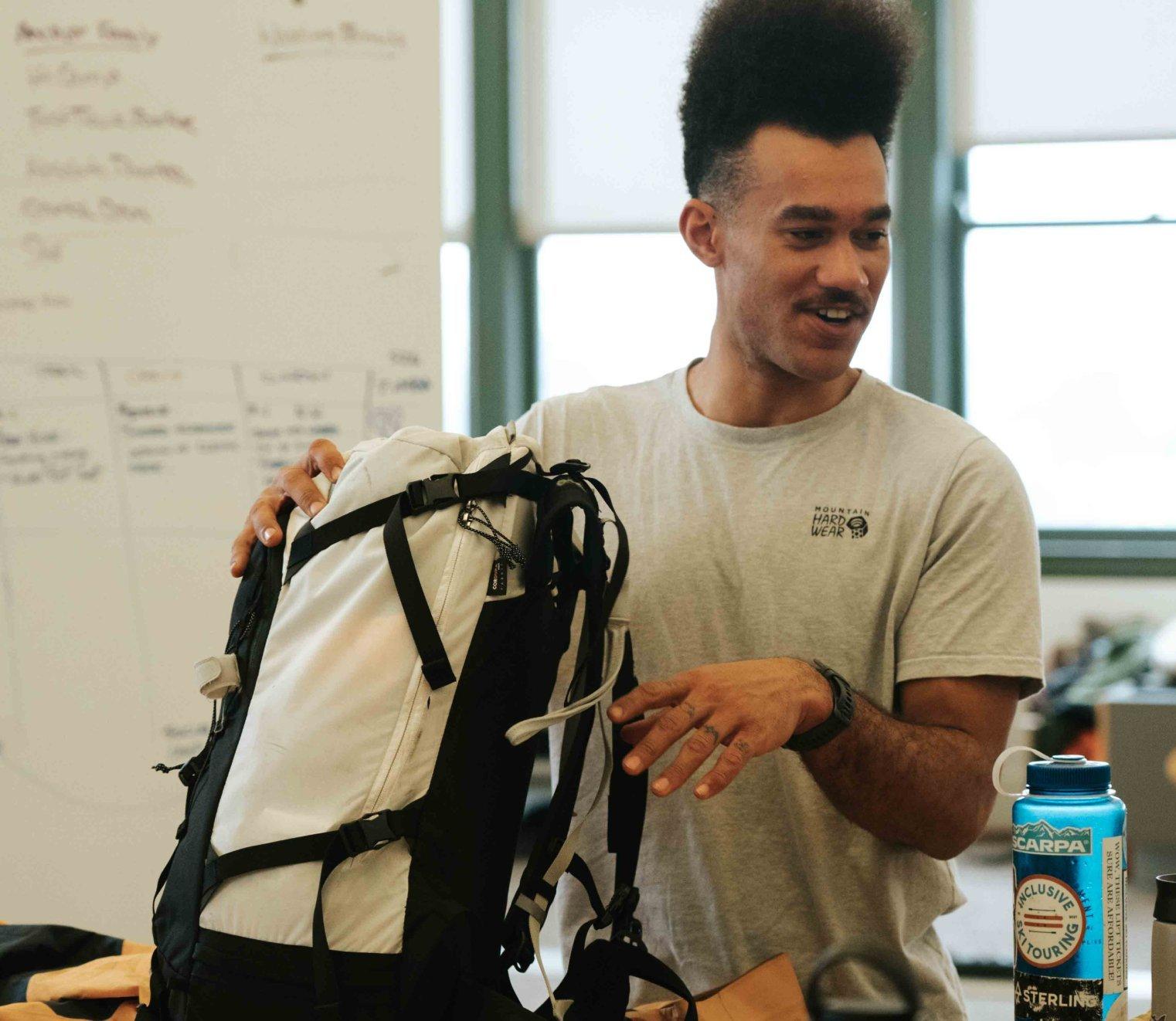 Noah Wheeler carrying a crash pad.