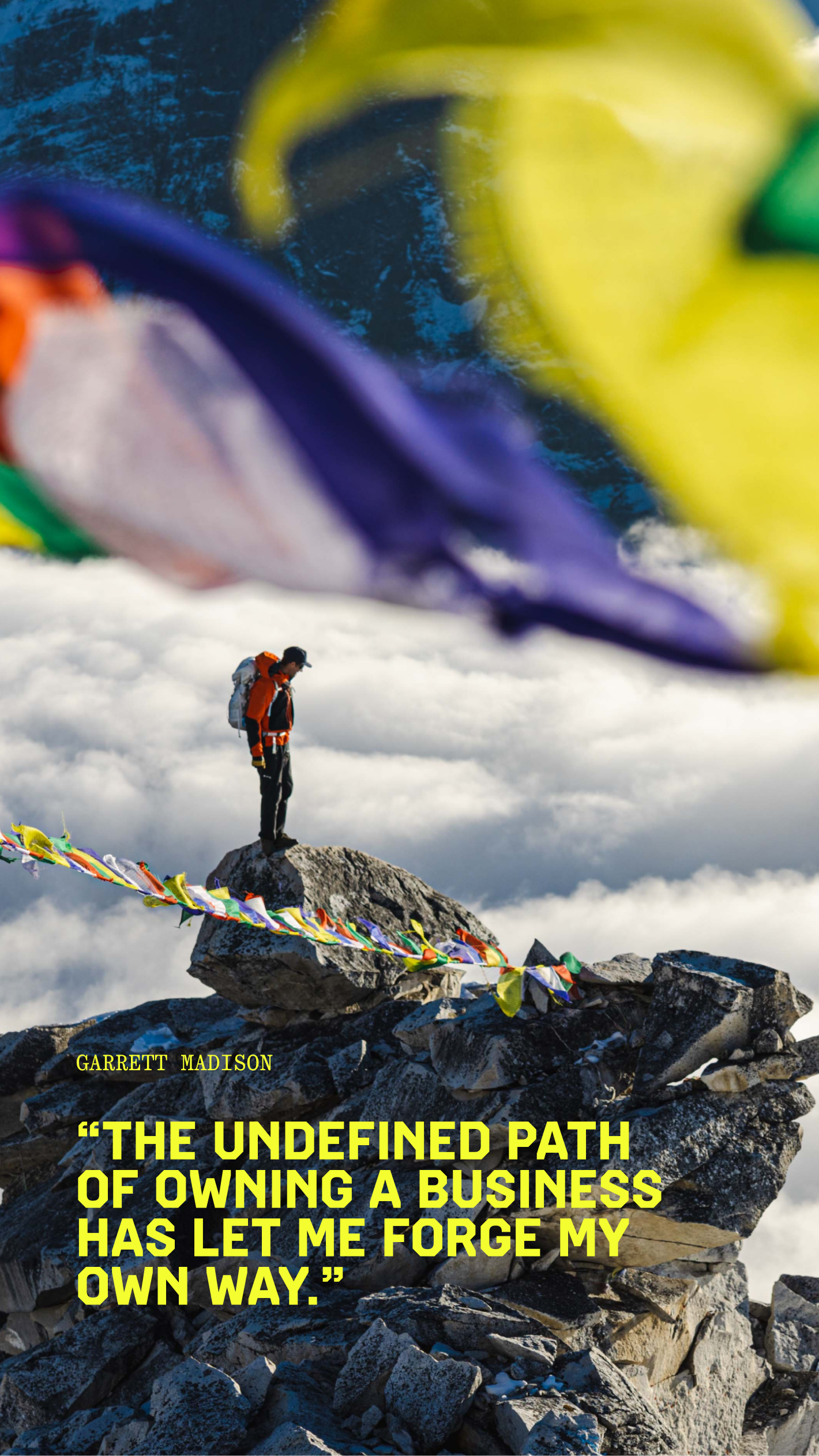 Garrett Madison summiting a mountain wearing Mountain Hardwear Men's Absolute Zero™ Suit.